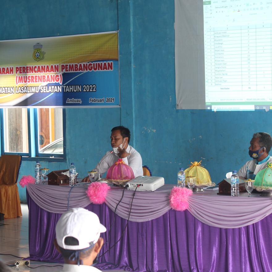 Lasalimu - Musyawarah Perencanaan Pembangunan (Musrenbang) tingkat Kecamatan Lasalimu Selatan Kabupaten Buton hari ini (24/02/21) di selenggarakan bertempat di Aula Kantor Desa Lasalimu. Musrenbang ini dihadiri oleh 100 peserta yang terdiri dari perwakilan dari Bappeda Kab. Buton, beberapa Organisasi Perangkat Daerah (OPD) Kab. Buton, Tenaga Pendamping Profesional (TPP) Kab. Buton, Pemerintah Kec. Lasalimu Selatan serta perwakilan dari 16 desa yang ada di wilayah kecamatan Lasalimu Selatan.